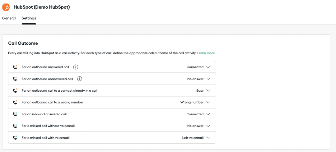 Für jeden Anruf erstellt die Integration eine Anrufaktivität (Engagement) in HubSpot und wendet das entsprechende Anrufergebnis an. Dies können Sie auf der Seite mit den HubSpot-Integrationseinstellungen in Ihrem Aircall-Dashboard konfigurieren.