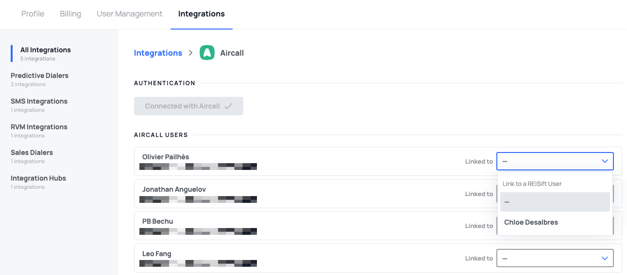 - Ordnen Sie jedem Aircall-Benutzer in Ihrem Unternehmen das entsprechende REISift-Benutzerkonto zu. Dies stellt sicher, dass Anrufe dem richtigen Benutzer in REISift korrekt zugeordnet werden.
