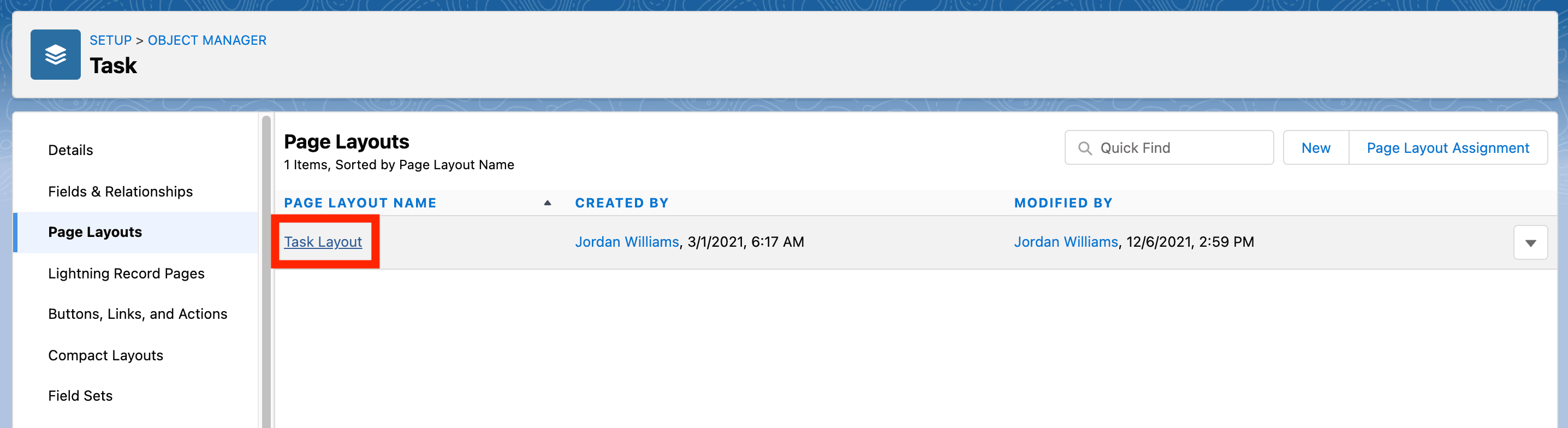 - Auf der Aufgaben-Seite klicken Sie auf Seitenlayouts und dann auf Aufgabenlayout.