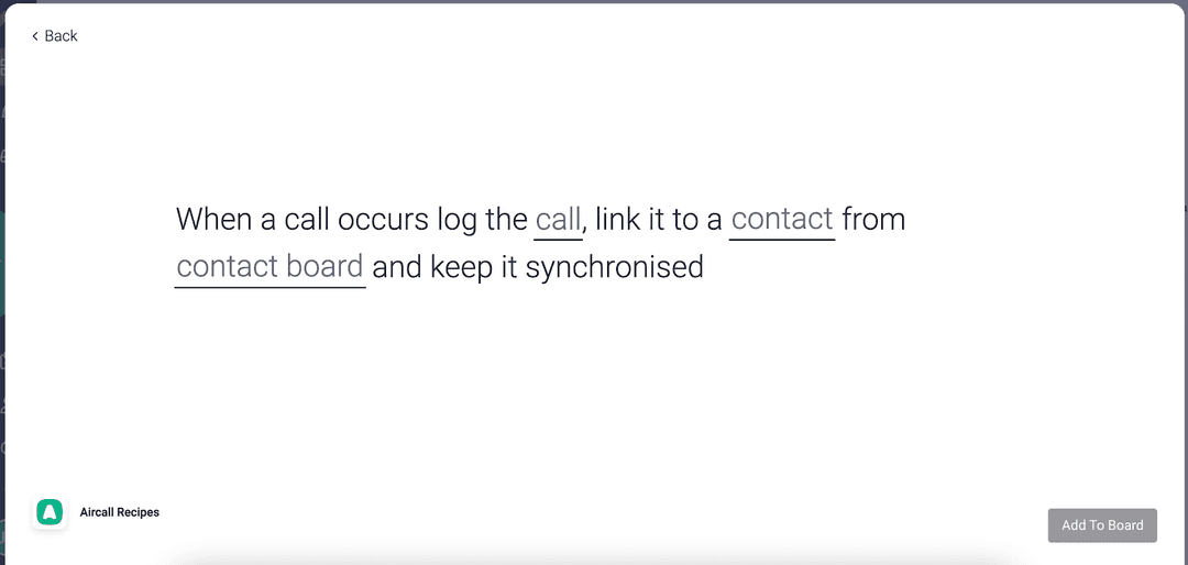 Um Anrufe in monday.com zu protokollieren, müssen Sie das Call Logging-Rezept (siehe Abbildung unten) in Ihr Aircall Calls-Board integrieren: