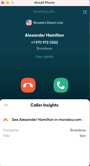 💡 Eine Insight Card ist ein Pop-up-Fenster, das auf dem Aircall-Telefon angezeigt wird, wenn Sie einen eingehenden Anruf erhalten. Es enthält alle Informationen, die Sie einschließen möchten – Kontaktname, Titel, E-Mail, Status usw. –, sodass Sie Anrufe mit Kontext annehmen und Gespräche sofort personalisieren können.