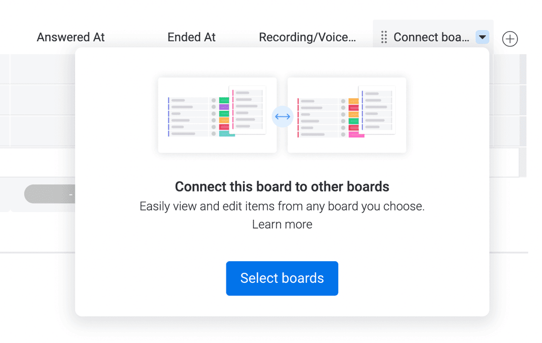 Wenn Sie eine Telefonnummernspalte in einem anderen Board verwenden: Öffnen Sie Ihr Aircall Calls-Board, scrollen Sie nach rechts, klicken Sie auf das Pluszeichen und wählen Sie „Boards verbinden“. Wählen Sie dann das Board aus, das Telefonnummern enthält.