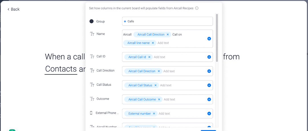 Nachdem Sie als erste Auswahl „Anrufen“ gewählt haben, werden Sie aufgefordert, Aircall-Informationen bestimmten Spalten im Aircall-Anruf-Board zuzuordnen.