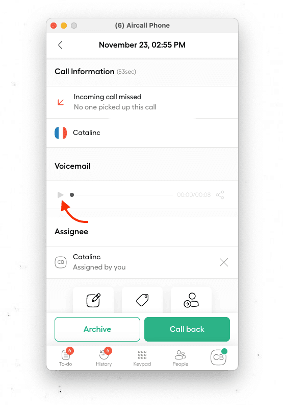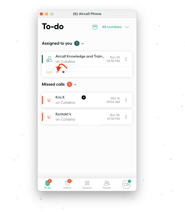 ⚠️ Bitte beachten Sie, dass Sie einer Telefonnummer zugewiesen sein müssen, um Voicemails in der Anwendung sehen zu können. Diese erscheinen im To-do-Bereich Ihres Aircall-Telefons.