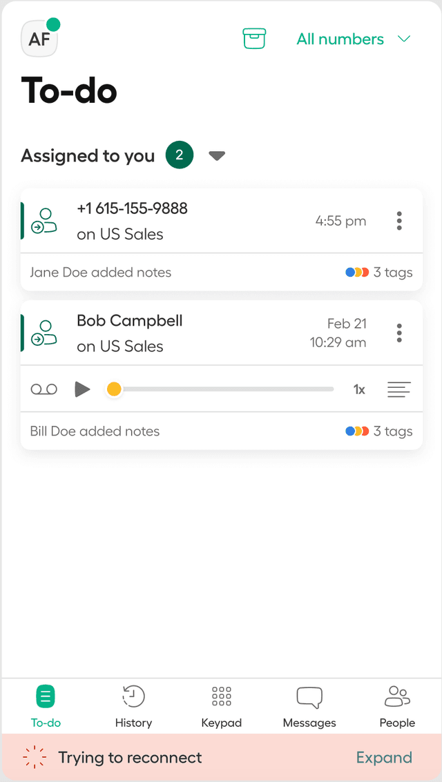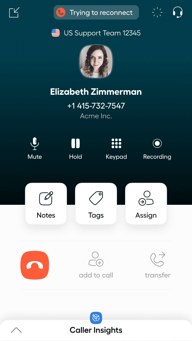 Um mehr Anrufe auch unter schwierigen Netzwerkbedingungen verbunden zu halten, versucht die Aircall-Telefon-App, sich bis zu 15 Sekunden lang mit einem verfügbaren Netzwerk erneut zu verbinden, während der Aircall-Benutzer darüber informiert wird, dass er ein Verbindungsproblem hat.
