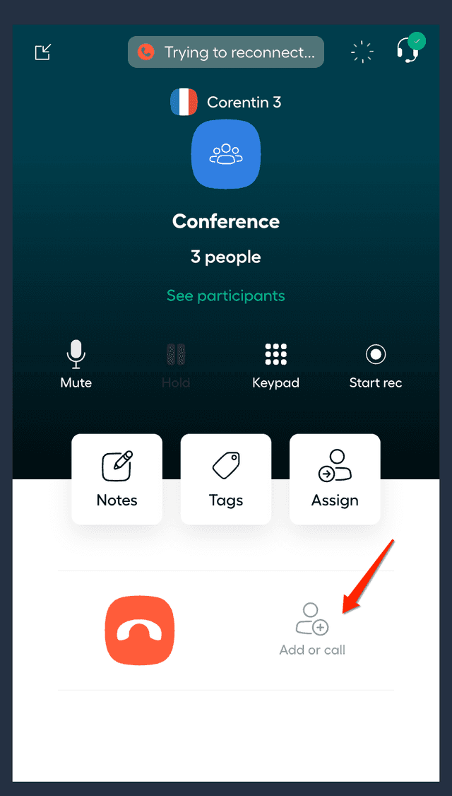 Solange bei einem Aircall-Benutzer ein Verbindungsproblem festgestellt wird, ist die Möglichkeit, eine weitere Person zu einem Konferenzanruf hinzuzufügen oder anzurufen, deaktiviert, bis die Aircall-Telefon-App den Anruf wieder verbinden kann.