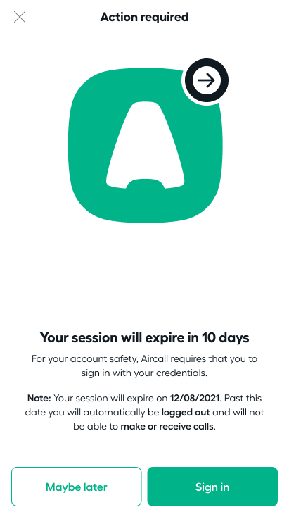Bei der Verwendung der Aircall Workspace-App für iOS müssen Sie sich mindestens alle 90 Tage einmal abmelden. Nach 90 Tagen durchgehender Anmeldung läuft Ihr ID-Token ab und Sie werden nicht in der Lage sein, Anrufe zu tätigen oder zu empfangen, bis Sie sich erneut anmelden.