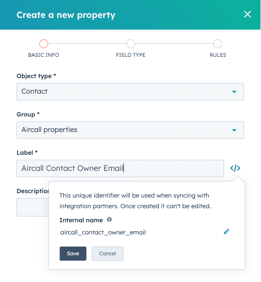Beginnen Sie in HubSpot, indem Sie eine benutzerdefinierte Eigenschaft erstellen, um die E-Mail-Adresse des Kontaktinhabers zu speichern.