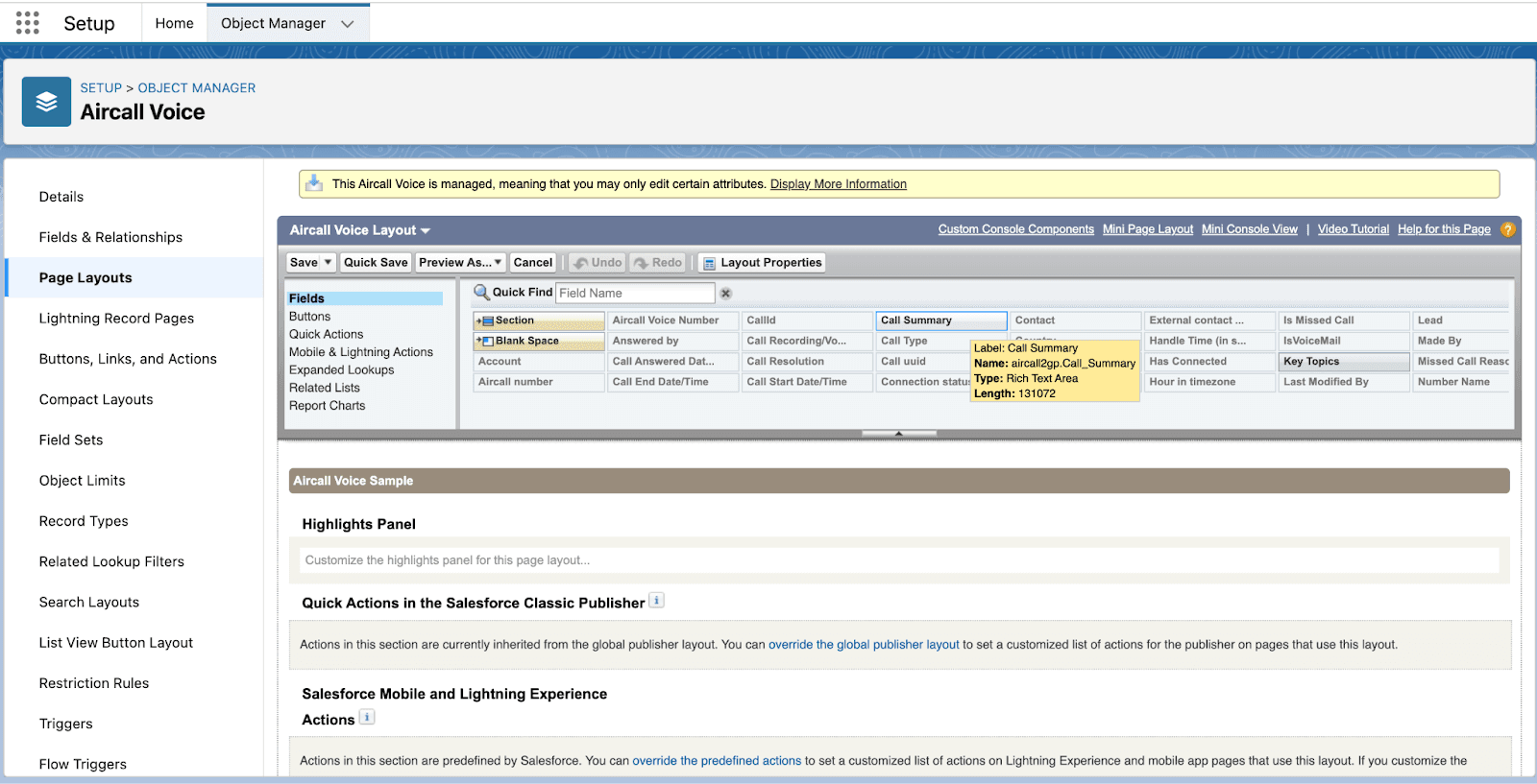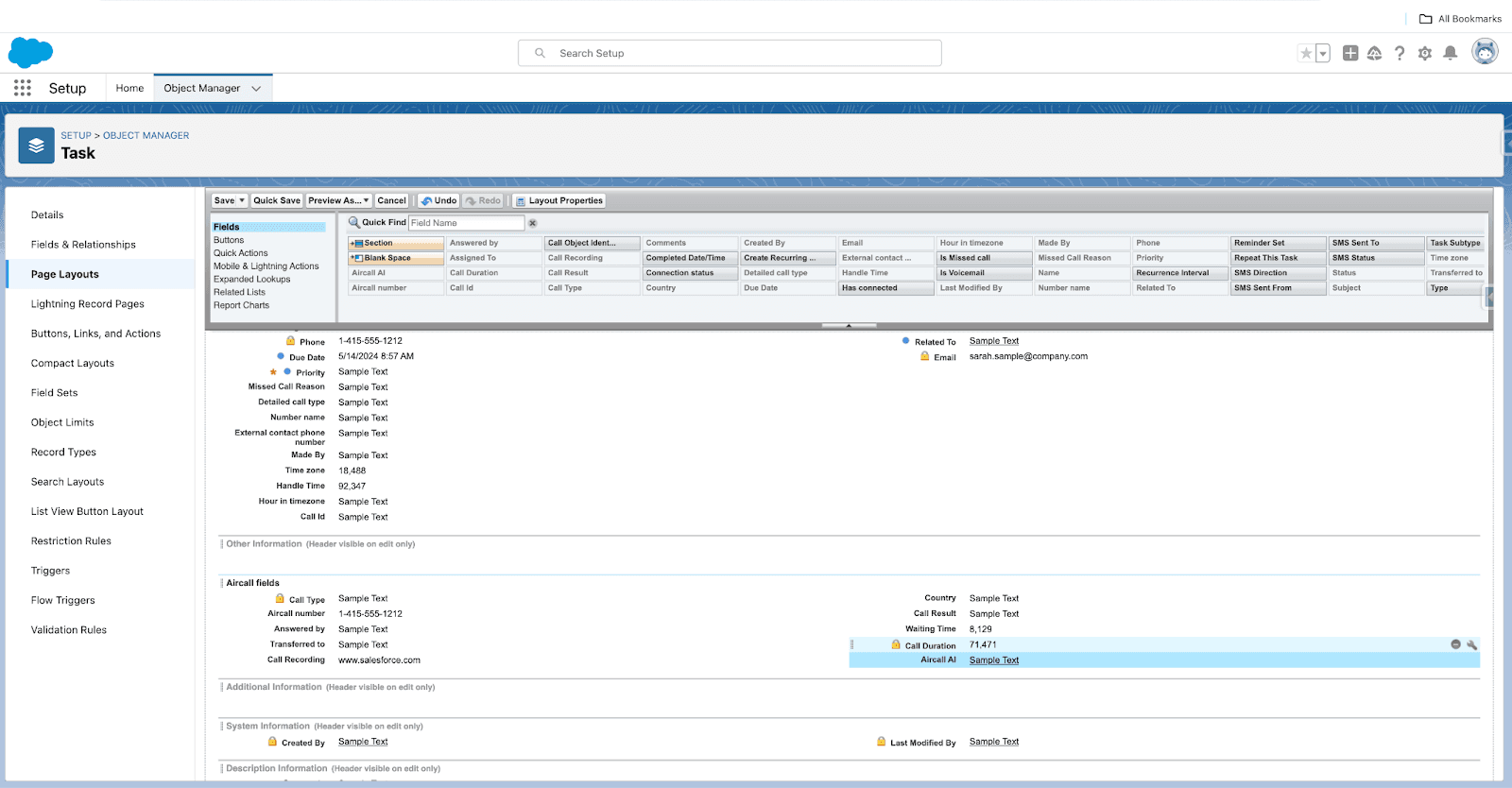 Im Aircall AI-Objekt sollten Sie die Felder Kundenstimmung, Schlüsselthemen und Anrufzusammenfassung sehen. Falls Sie nicht alle diese Informationen sehen, navigieren Sie zu Setup → Object Manager, suchen Sie das Aircall AI-Objekt und fügen Sie diese drei Felder dem Layout auf die gleiche Weise hinzu, wie Sie das Aircall AI-Feld dem Task-Objekt-Layout hinzugefügt haben.
