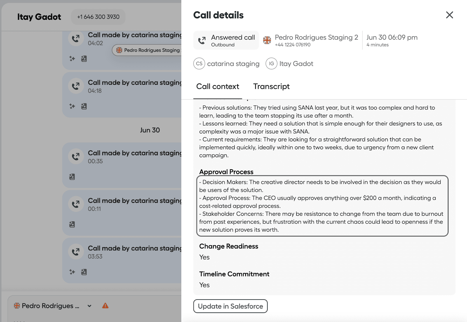 Im Sales Engagement-Integrationspaket werden KI-Erkenntnisse protokolliert, ohne dass ein Paket-Upgrade erforderlich ist. Die Erkenntnisse erscheinen als neue Felder im Aircall Voice-Objekt.