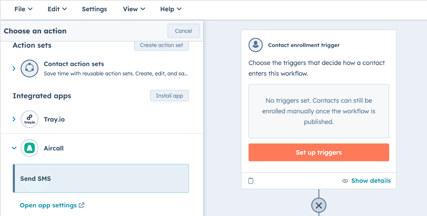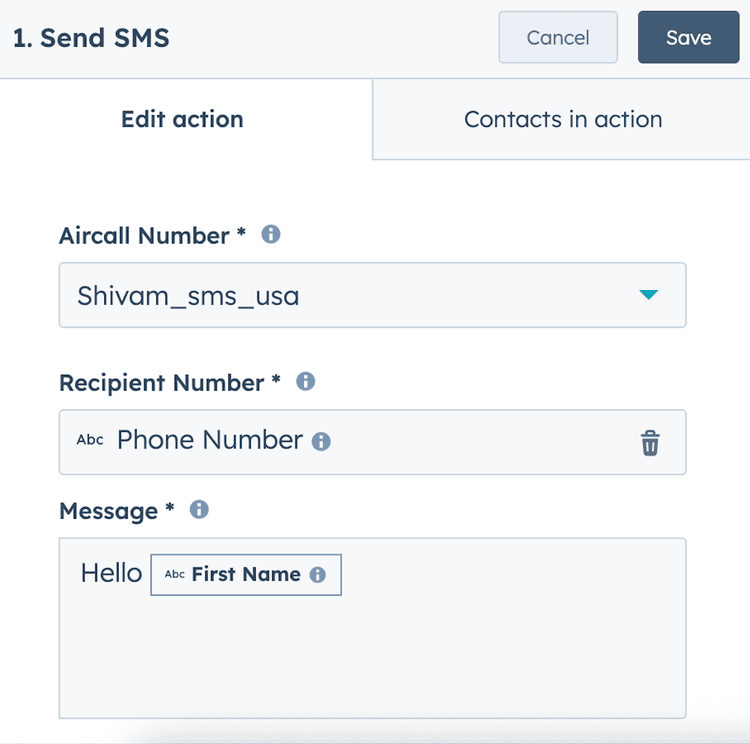 Sie können die SMS senden-Aktion in HubSpot-Workflows verwenden, um automatisch Textnachrichten von Ihren Aircall-Nummern zu senden. Dies ermöglicht es Ihnen, Kunden basierend auf Workflow-Auslösern und Kriterien anzusprechen und gleichzeitig die Kommunikation über beide Plattformen hinweg zu optimieren.