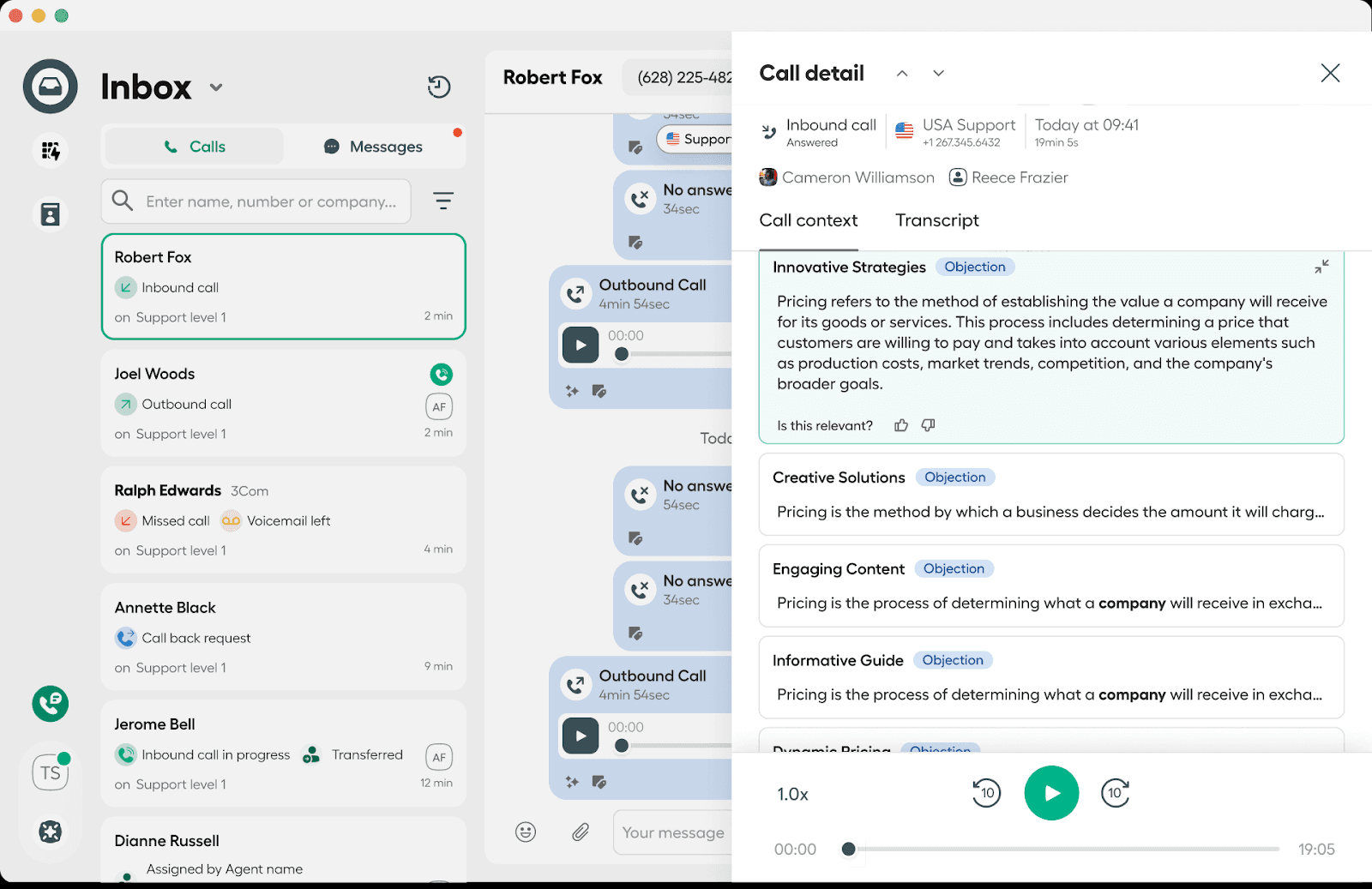 Die Echtzeit-Hilfe ist Teil des Aircall AI Assist Add-ons, und hilft Agenten im entscheidenden Moment - während eines Live-Anrufs - ihr Bestes zu geben. Die KI-gestützte Unterstützung bietet sofortigen Zugriff auf wichtiges Wissen, einschließlich gängiger Einwände, häufig gestellter Fragen und vieles mehr. Wenn bestimmte Themen erkannt werden - z. B. eine Frage zu einem Mitbewerber - zeigt die KI relevante Informationen auf der Stelle an, sodass der Agent sicher und effektiv antworten kann.