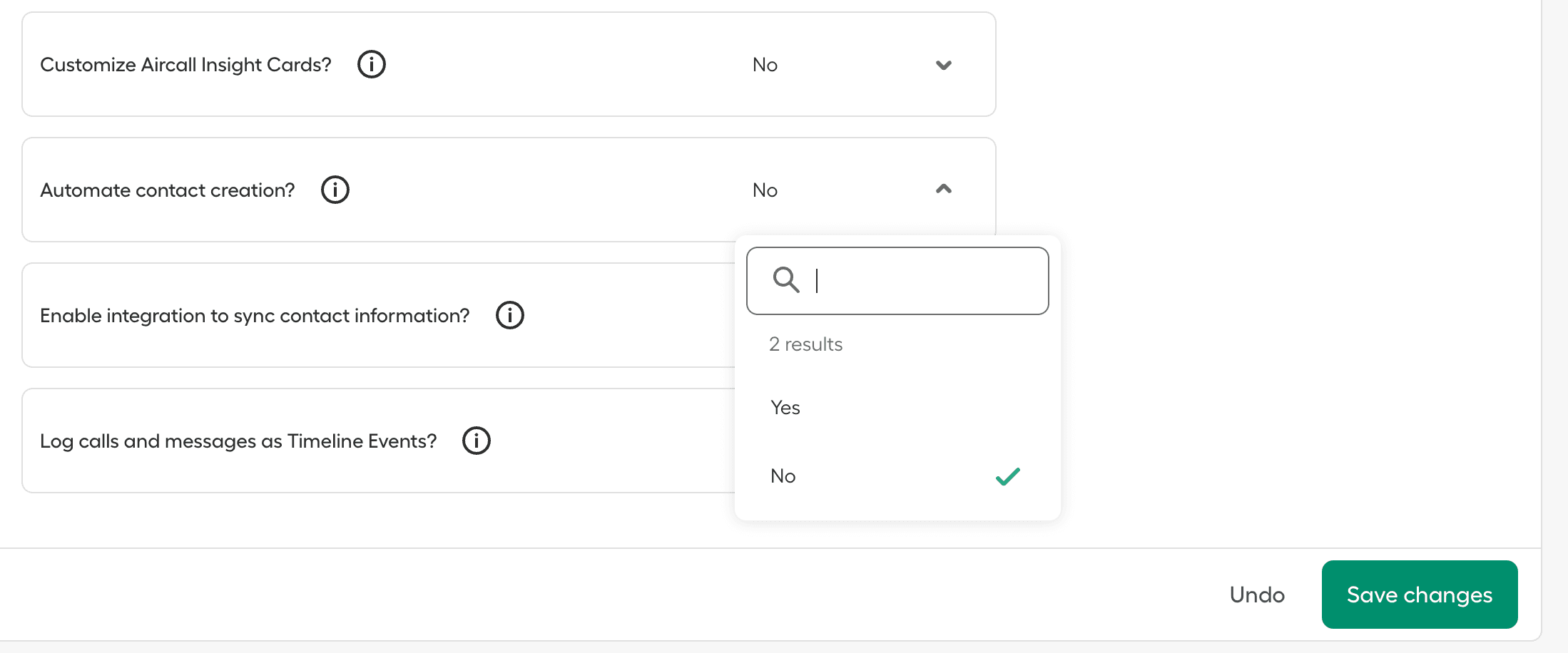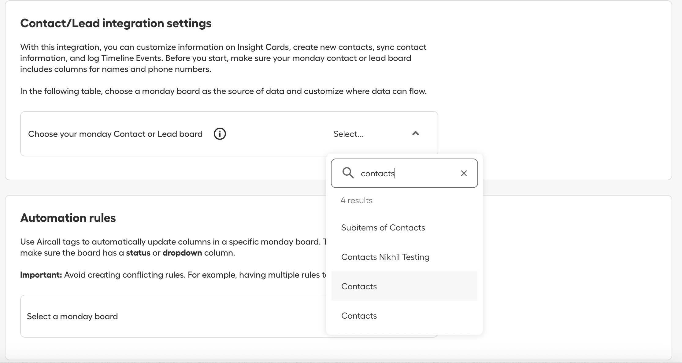 Aktivieren Sie diese Optionen, um Kontakte zwischen Aircall und monday.com zu verwalten: