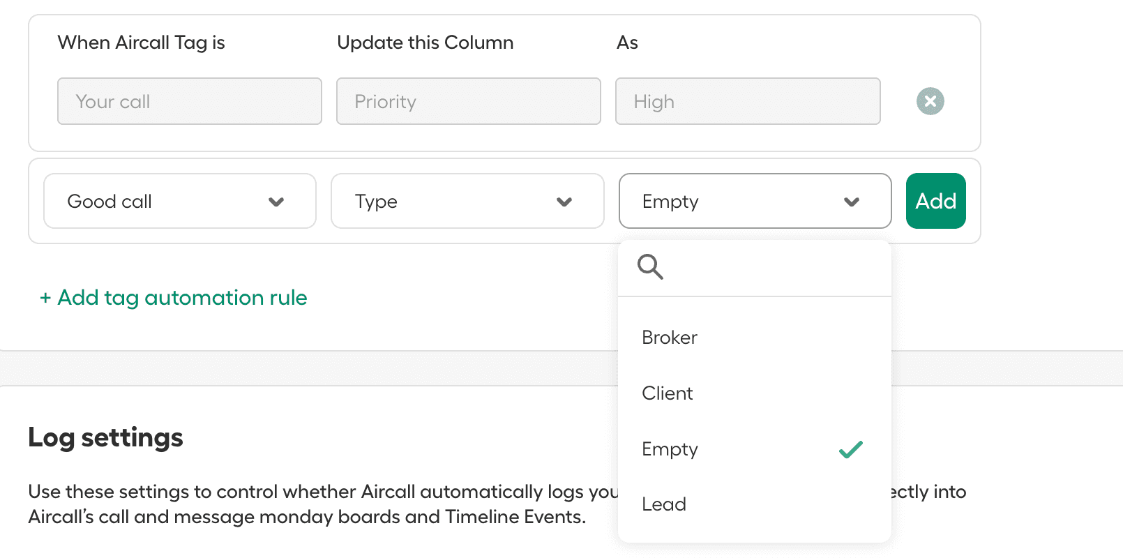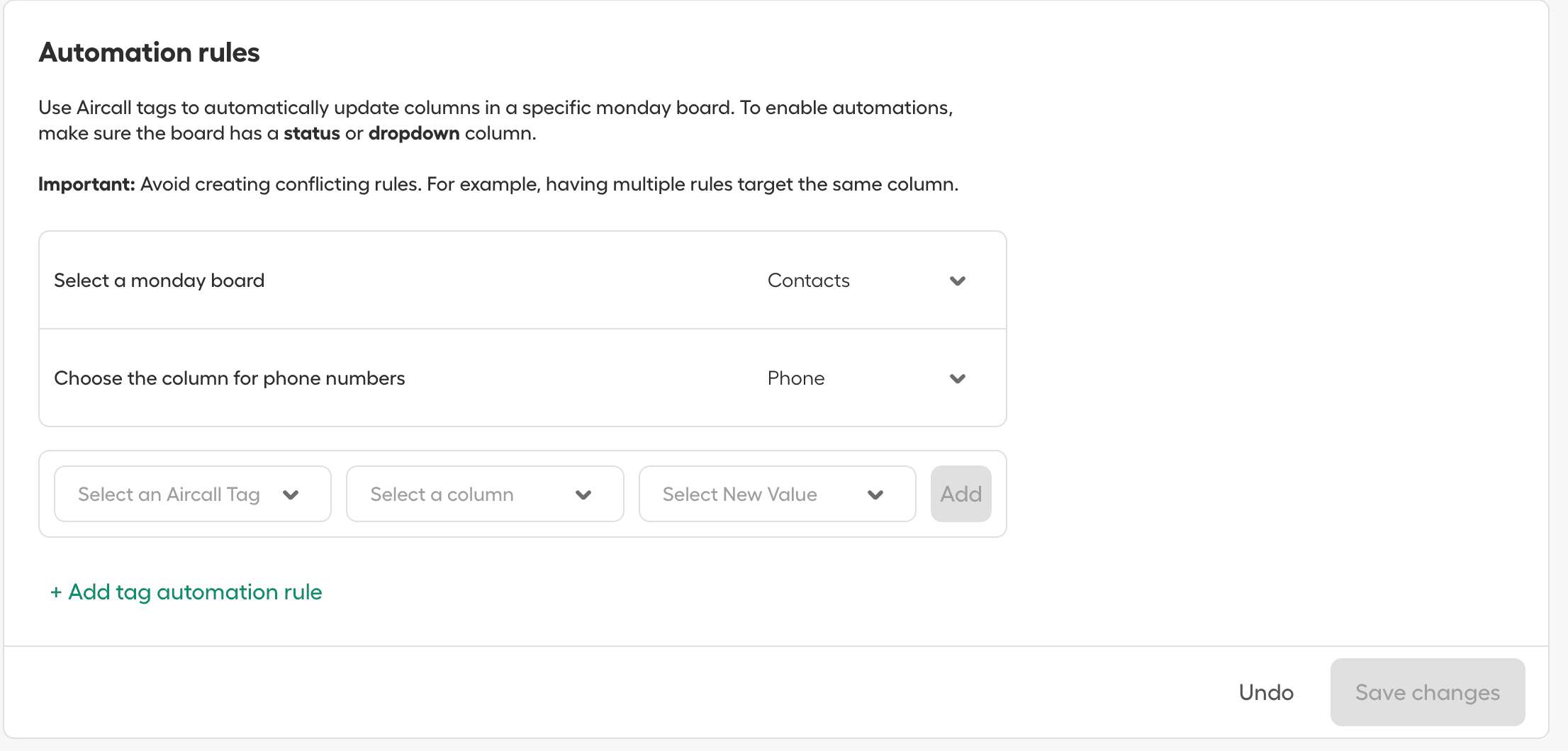 Sie können Automatisierungsregeln auf bestimmten Boards einrichten, um Werte basierend auf Aircall-Tags zu aktualisieren, die während Anrufen verwendet werden.