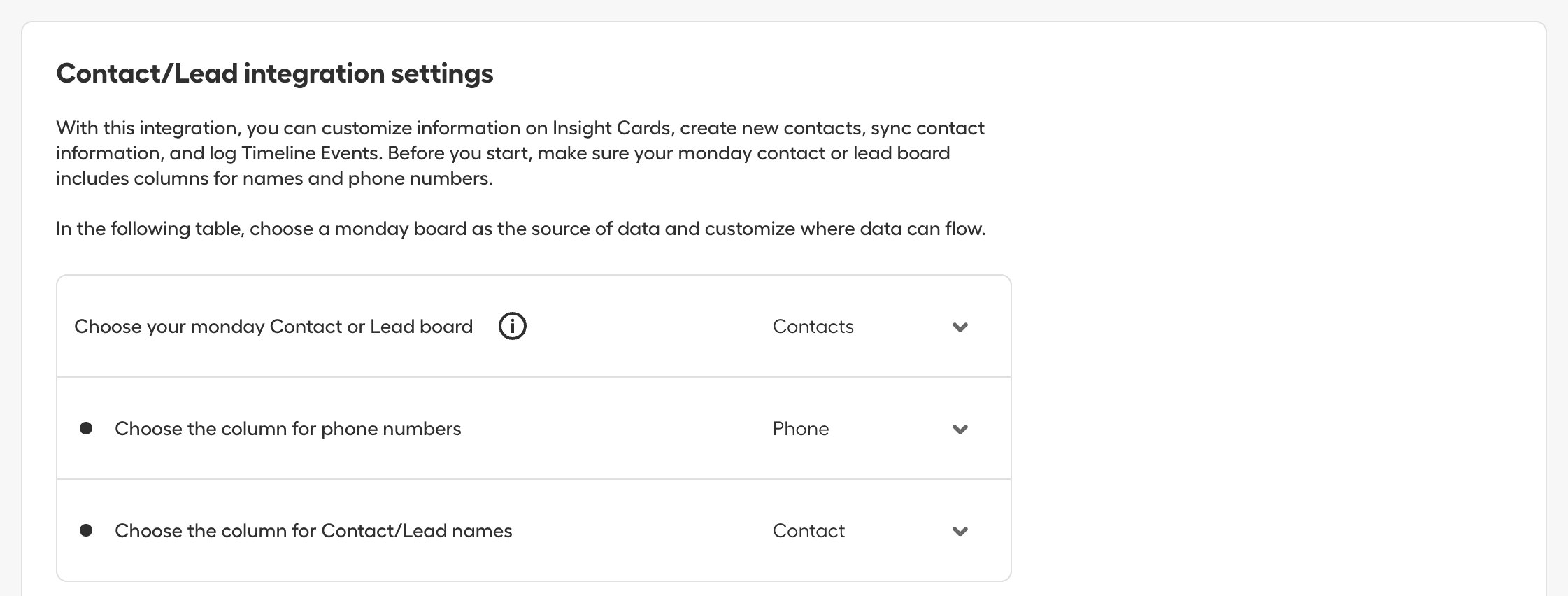 Mit diesen Einstellungen können Sie ein monday.com-Board verknüpfen, das Kontakt- oder Lead-Daten verwaltet.