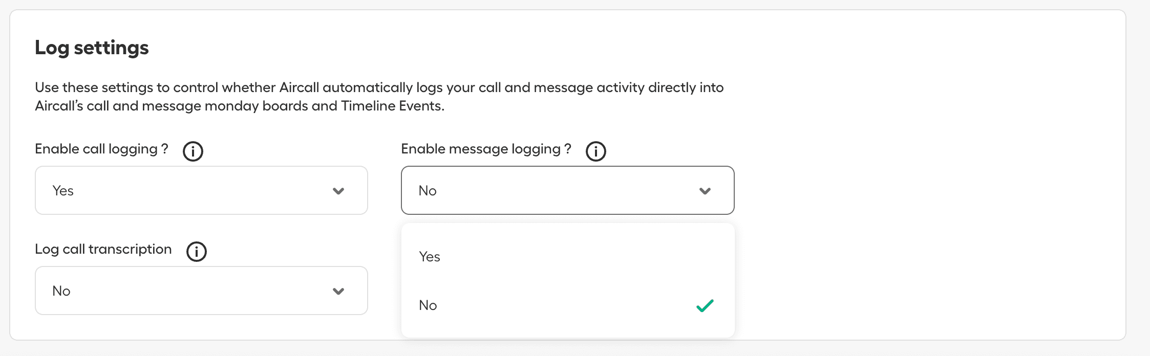 WICHTIG: • Wenn sowohl Anrufprotokollierung als auch Timeline-Ereignisprotokollierung deaktiviert sind, werden keine Kommunikationsdaten in monday.com protokolliert. • Wenn Kontaktboards nicht richtig eingerichtet sind, wird der Standard-Kontaktname "Aircall New Contact" in Protokollen verwendet. • Die Nachrichtenprotokollierung umfasst sowohl SMS als auch WhatsApp. • Anruftranskript-Protokolle werden sowohl dem Board Aircall Calls als auch Timeline-Ereignissen hinzugefügt, falls aktiviert.