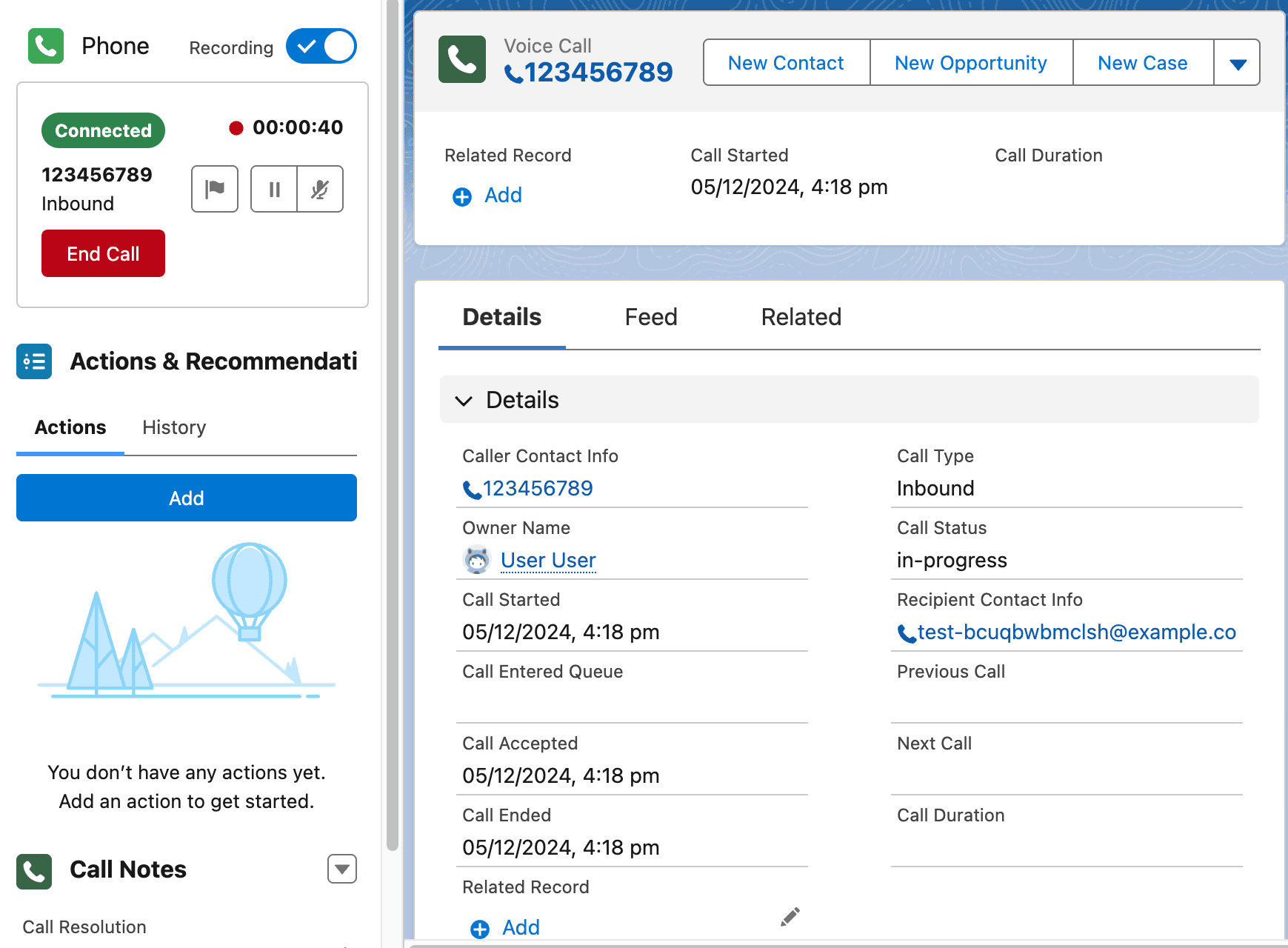 - Nachdem der Agent den Anruf entgegengenommen hat, wird ein Sprachanruf-Datensatz in Salesforce erstellt.