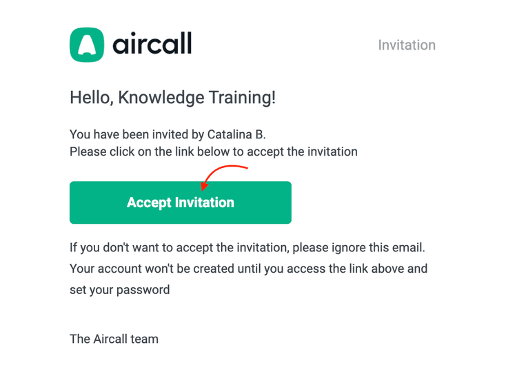 Once your user has been created in the Aircall Dashboard, you will receive an email that invites you to Aircall by your Admin.