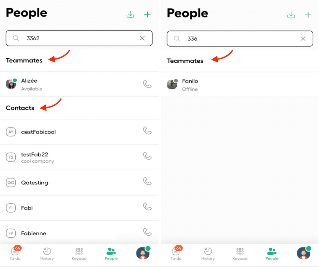 To trigger a search of Contacts in the phone, you will need to enter at least 3 characters. Anything less than 3 characters will return a search for Teammates only.