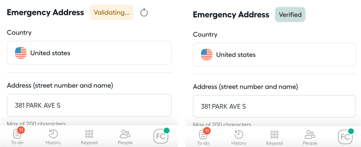 An emergency address is required for US and Canadian numbers. When located in the US or Canada, this address is provided to responders when a user dials 911. Users must provide an accurate address and keep it up to date at all times.