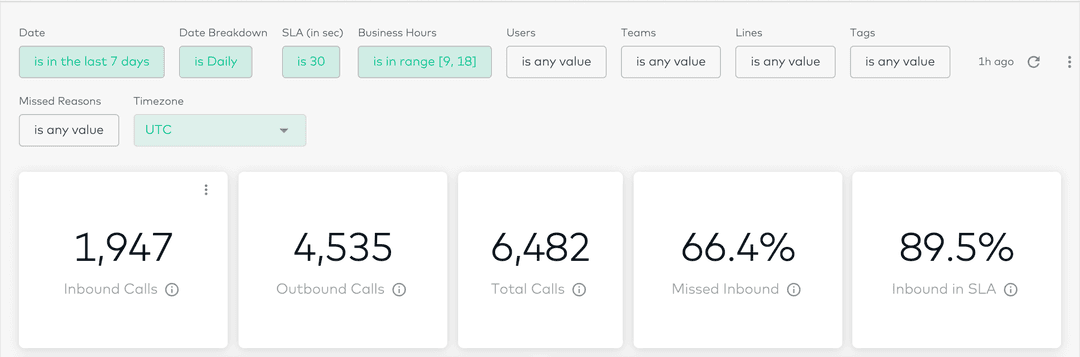 🔎 Charts detailing top missed reasons, called back, and most active users