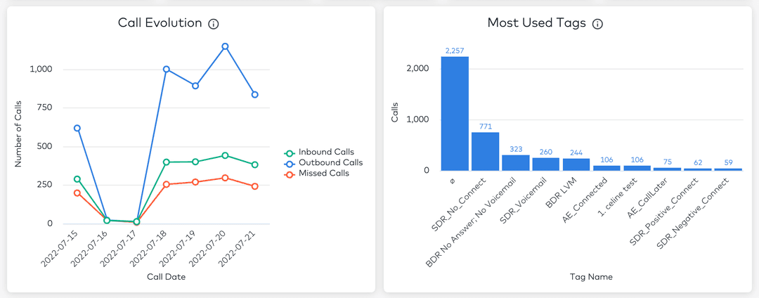 This graph displays the 10 most used tags in your calls. Calls with no tags are also represented in this graph. A call with multiple tags will be counted multiple times and the drill-down allows you to hone in on the call details per tag.