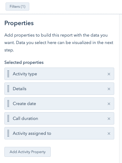 In the Data section, add the properties Call duration and Activity assigned to.