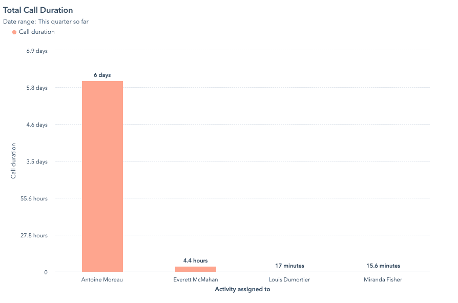 Below are several examples of reports you can easily build in HubSpot to track your team’s call activity.