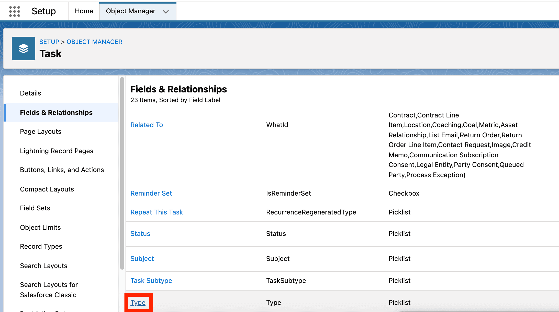 On the Task Fields page, find and click on Type