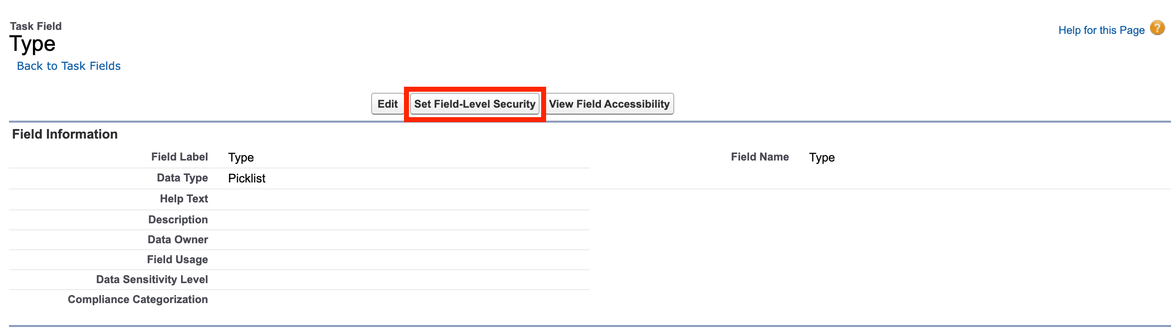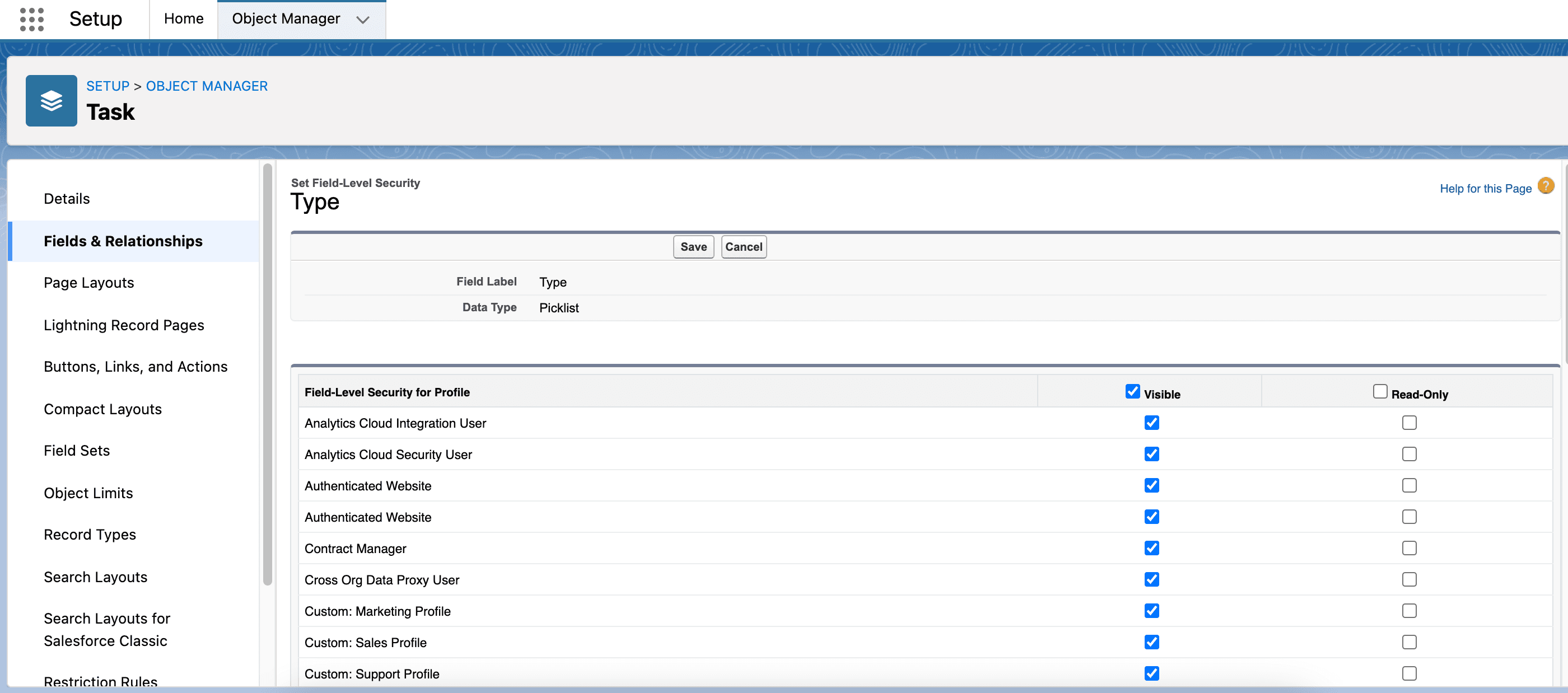 On the Type page, click Set Field-Level Security