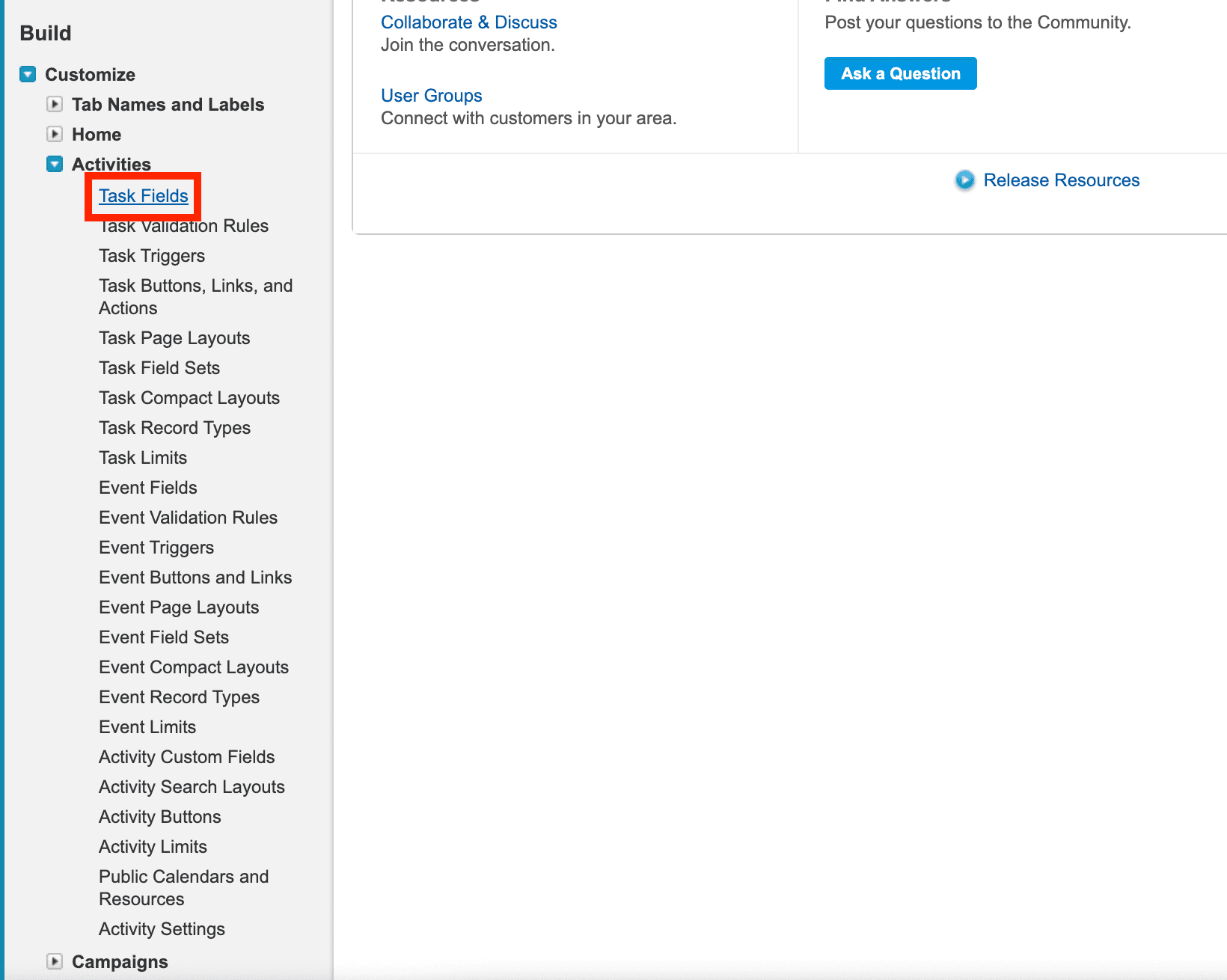 Click the drop-down for Customize, then Activities, then click on Task Fields.