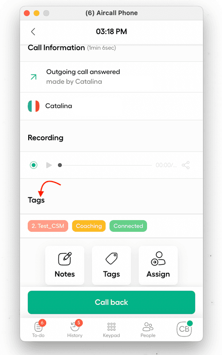 If you have Aircall integrated with a CRM, your tags will also be pushed with your call logs.