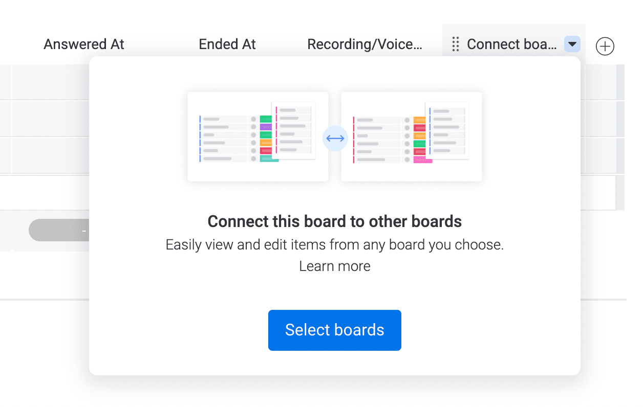 After the boards are connected, you can mirror columns from the Aircall Calls board to other boards. Mirroring allows you to surface call outcomes, tags, recordings, and more throughout your workspace.