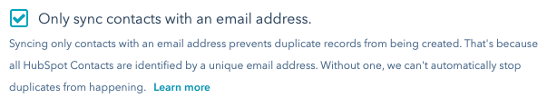 By default, HubSpot only syncs contacts that have a valid email address. You can disable this by clearing the checkbox in the sync settings.