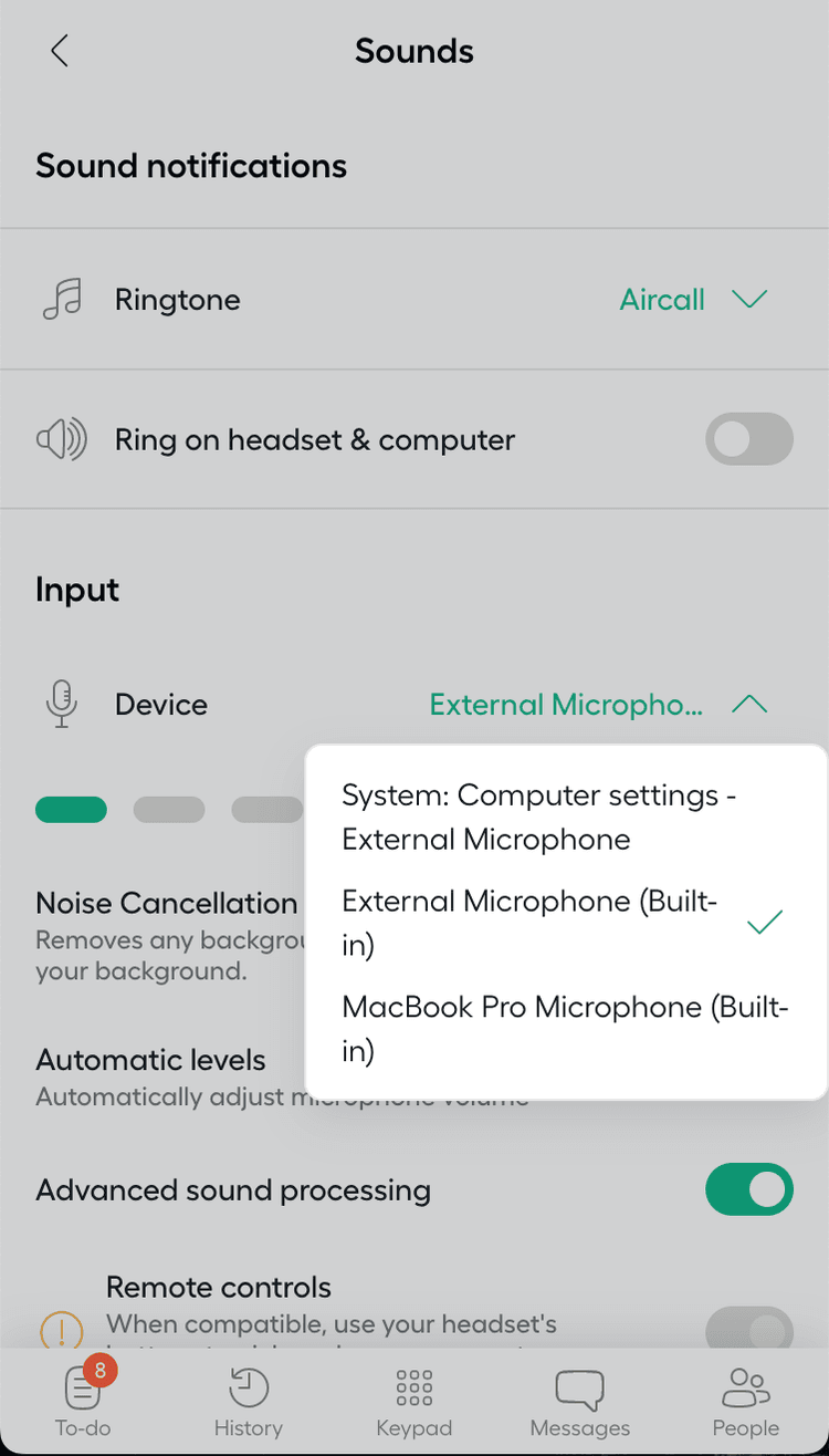 Note: Volume levels cannot be adjusted within Aircall. Manage volume directly in your computer's sound preferences.