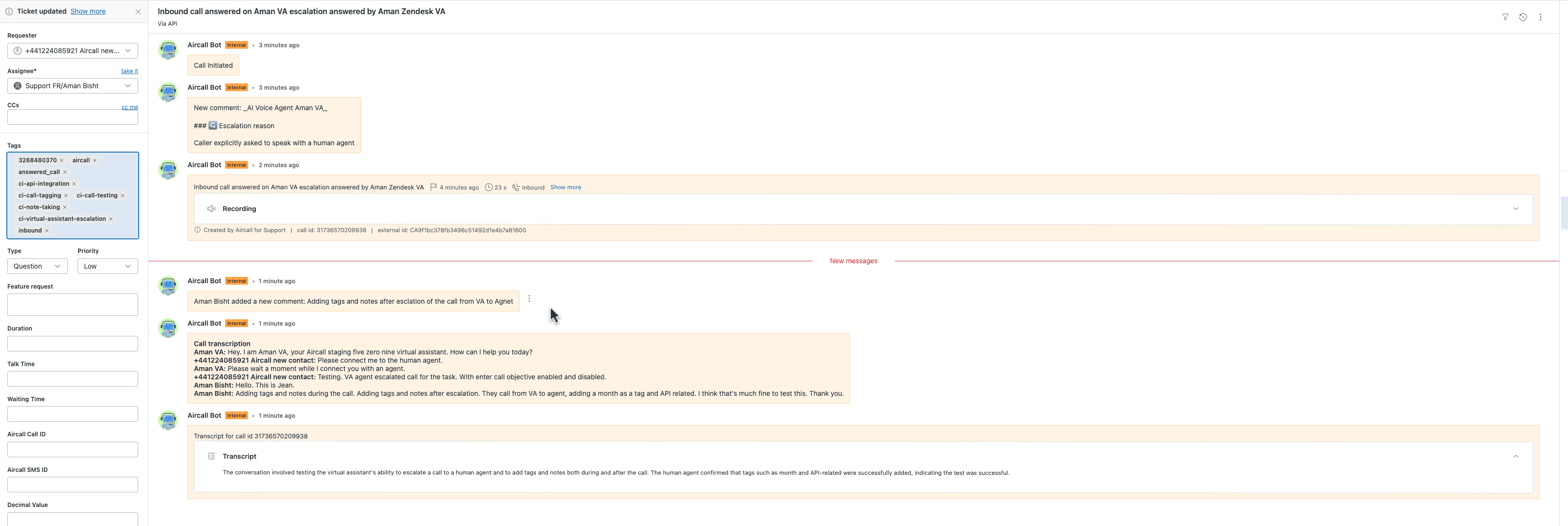 The Aircall-Zendesk integration now supports logging WhatsApp messages (text only) into Zendesk tickets.