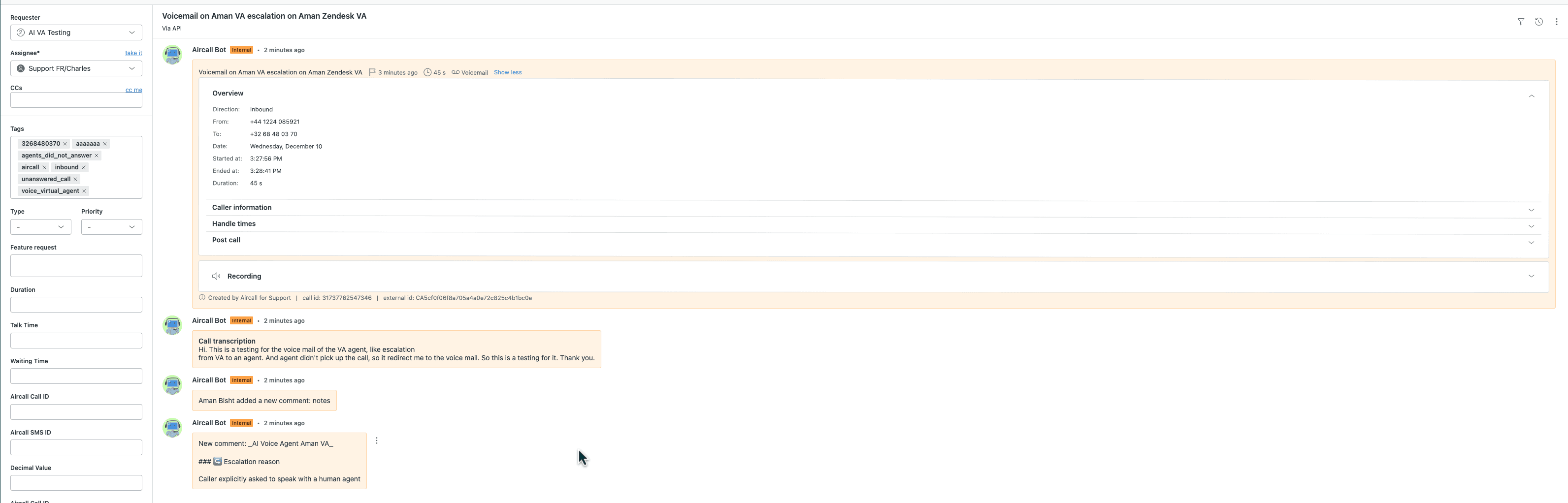 - Tags showing that it was a Voice Agent call