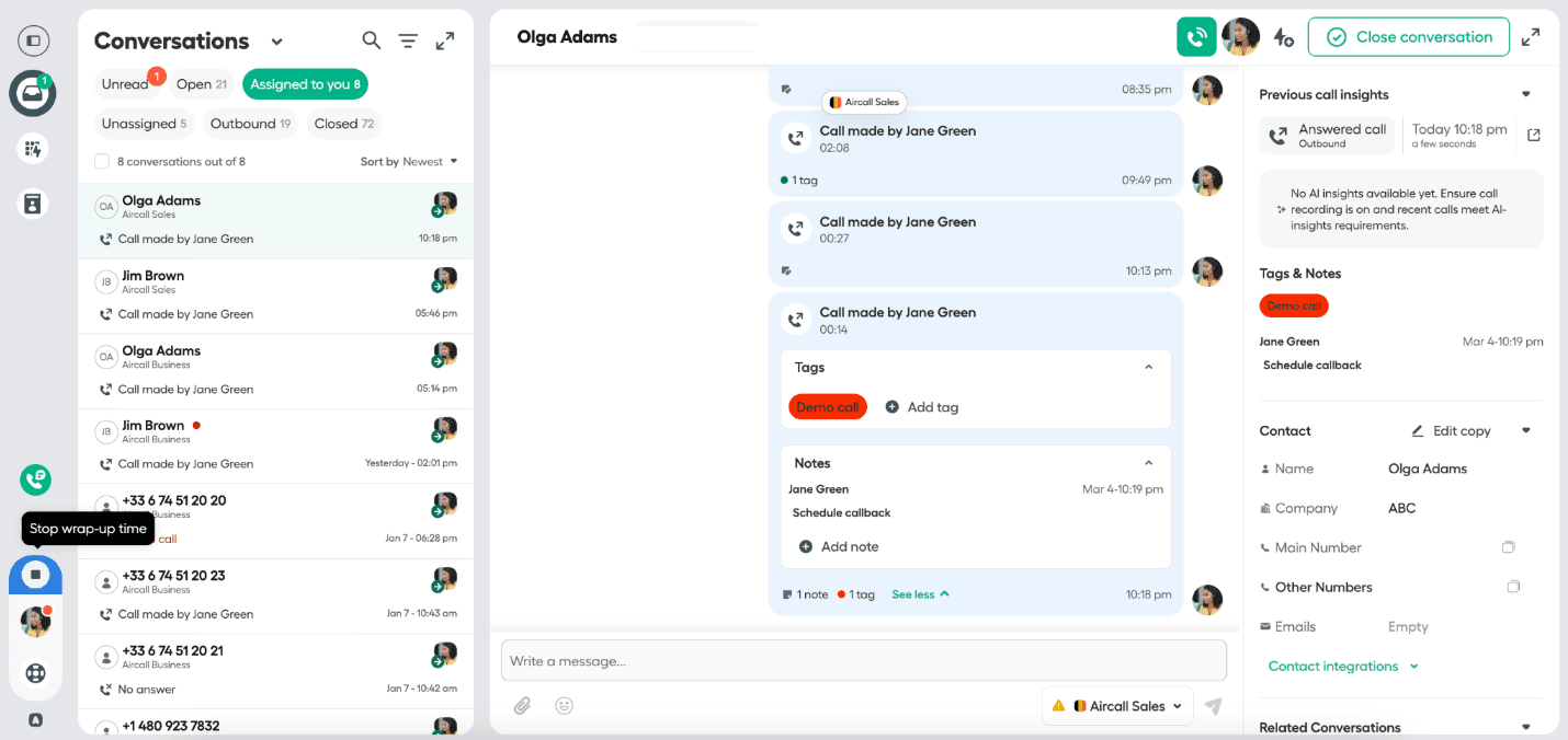 After each call, you may need a few moments to complete post-call tasks such as adding notes, tagging the call, or updating a record. Aircall’s Wrap-up time feature allows you to finish this after-call work before receiving another call.