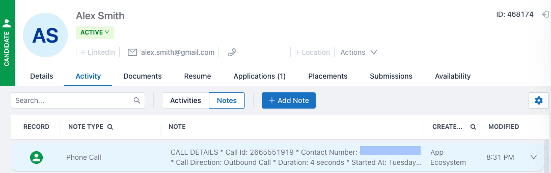 When a call ends, if the contact or candidate exists in JobAdder, the integration creates a JobAdder activity with the following details: