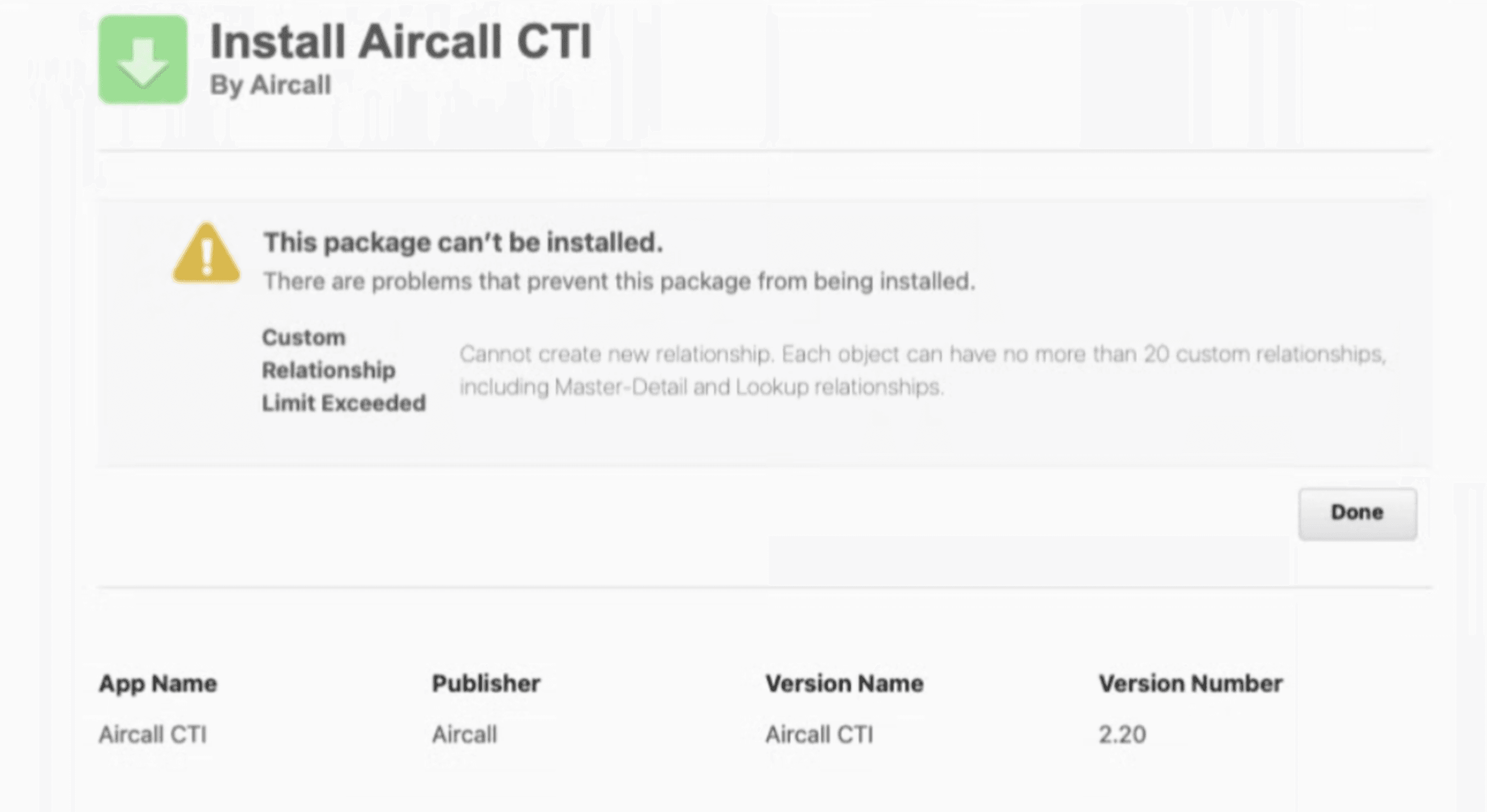 The Aircall CTI package includes 27 custom fields. If adding these fields pushes your Salesforce organization beyond its custom field limit, the installation cannot proceed and an error message will appear.