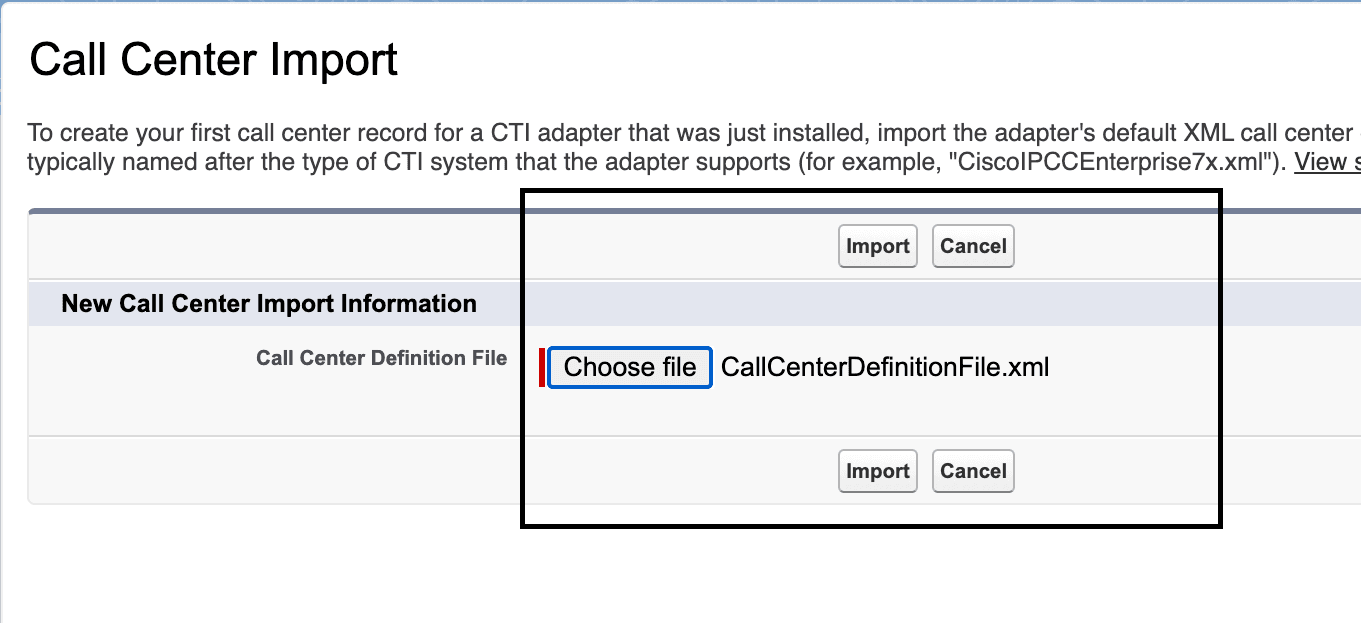 Si encuentras problemas con el archivo de definición del centro de llamadas al instalar el paquete CTI de Aircall para Salesforce, o simplemente necesitas añadir el CTI manualmente, puedes importar el CTI de Aircall en tu entorno de Salesforce usando un archivo XML de definición del centro de llamadas.