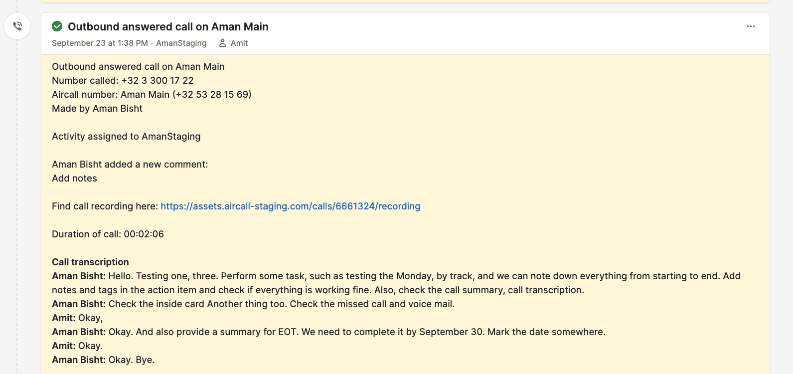 (por ejemplo, Llamada entrante contestada en [nombre del número Aircall]) - Fecha y hora