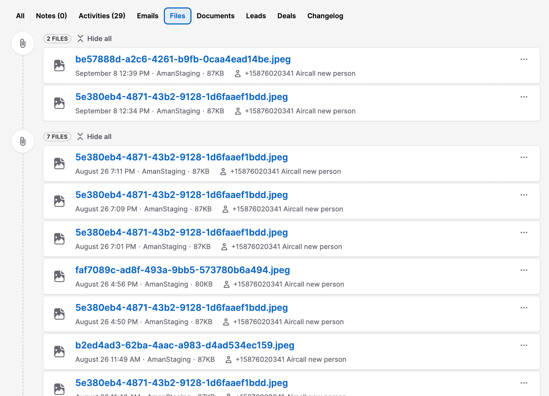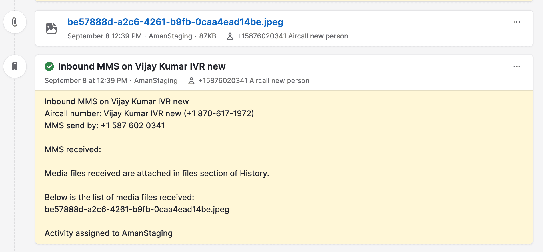 Los mensajes MMS enviados o recibidos a través de números Aircall habilitados para SMS/MMS vinculados a Pipedrive se registran como Notas de actividad. Los archivos multimedia se listan y son accesibles en la pestaña Archivos.