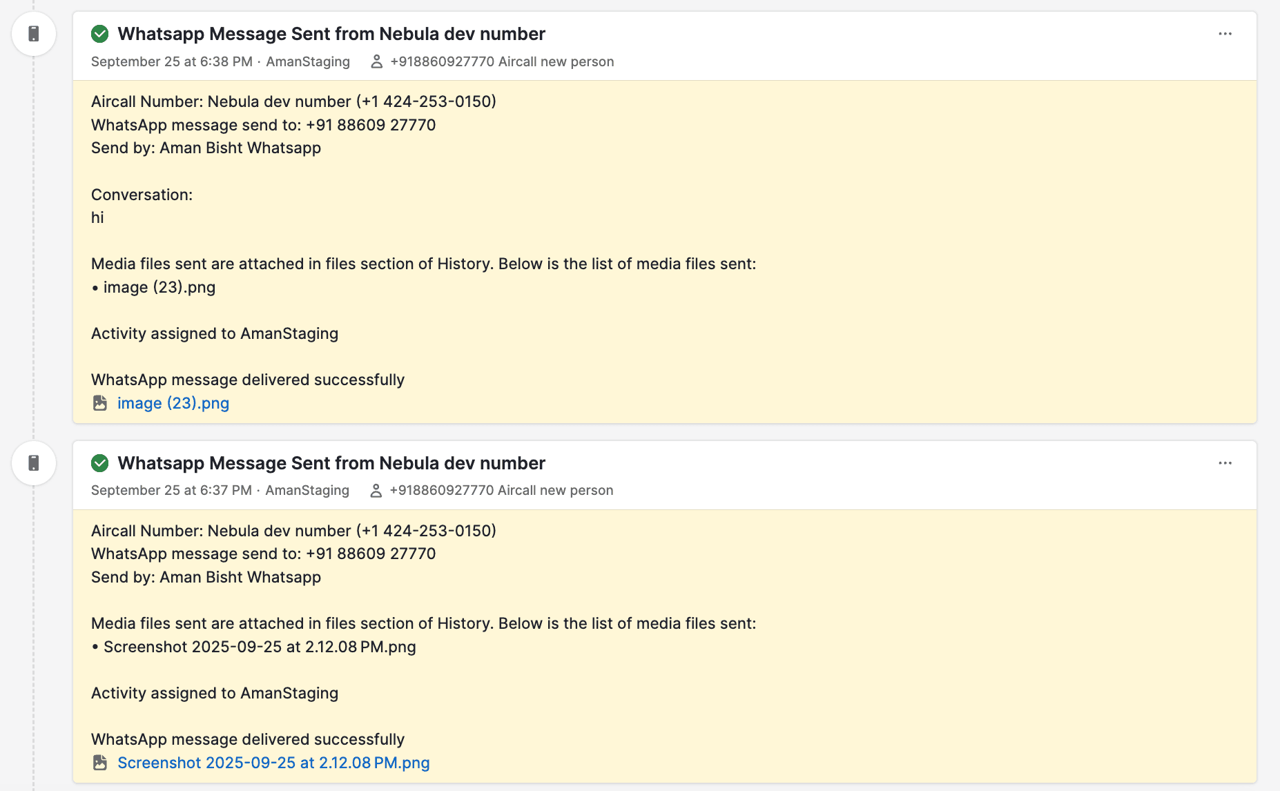 Los mensajes de WhatsApp (texto y multimedia) enviados o recibidos a través del canal WhatsApp de Aircall se registran en Pipedrive como Notas de actividad para los números asociados.