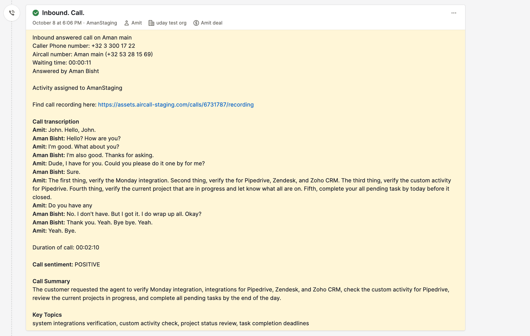Con Aircall AI, puedes registrar Transcripciones de llamadas en las Actividades de Pipedrive.