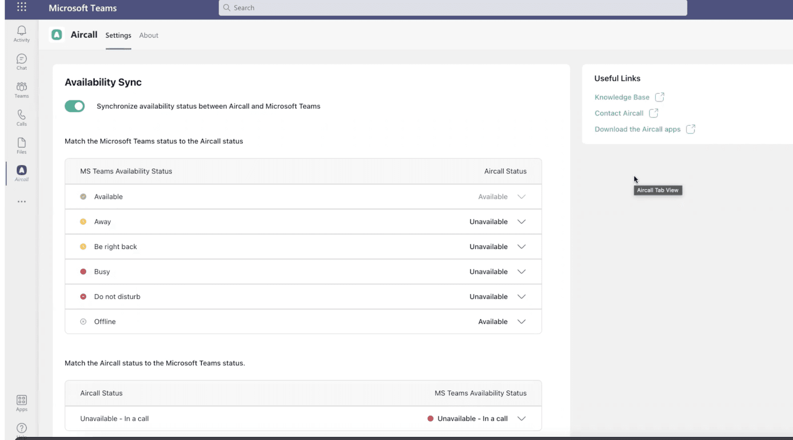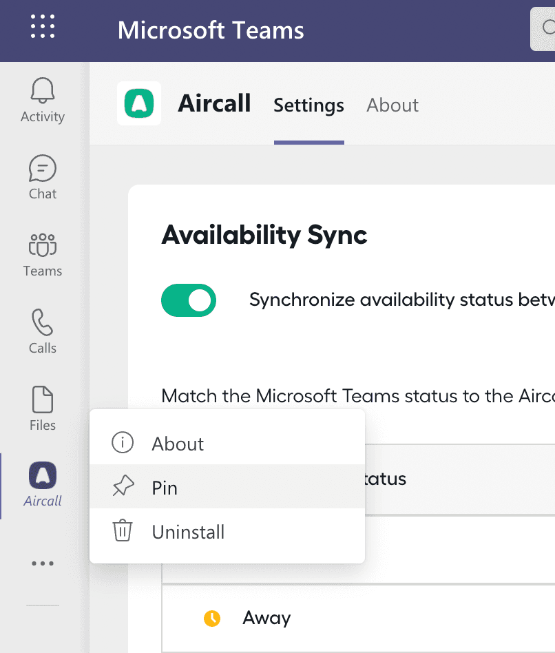 Los usuarios deben establecer sus preferencias de sincronización de disponibilidad en la aplicación Aircall para Teams: