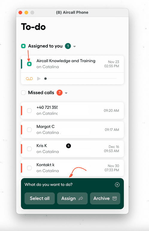 Seleccionar múltiples llamadas y asignarlas a otro usuario de Aircall.