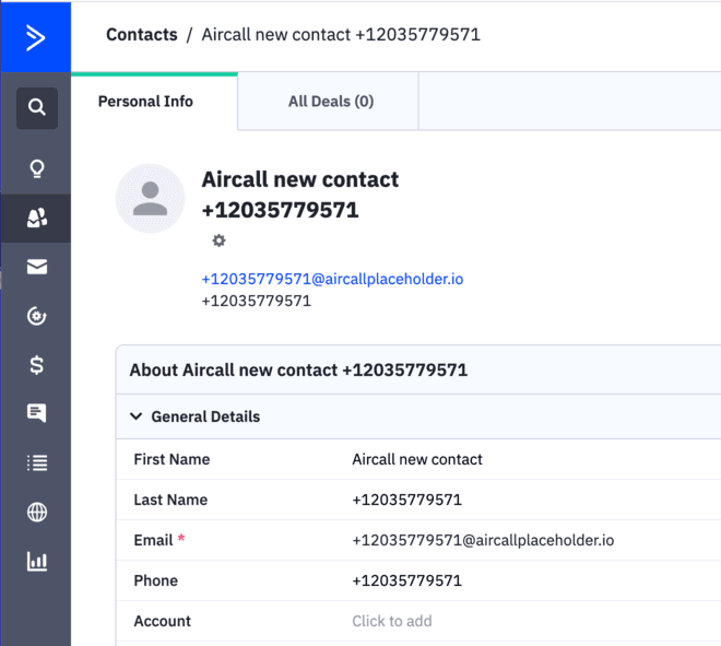 Cuando recibes una llamada de un número desconocido, Aircall crea automáticamente un nuevo registro de Contacto en ActiveCampaign con el número de teléfono adjunto.