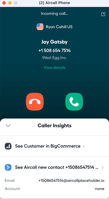 Al realizar o recibir una llamada, aparece una Insight Card en Aircall. Esta tarjeta muestra: