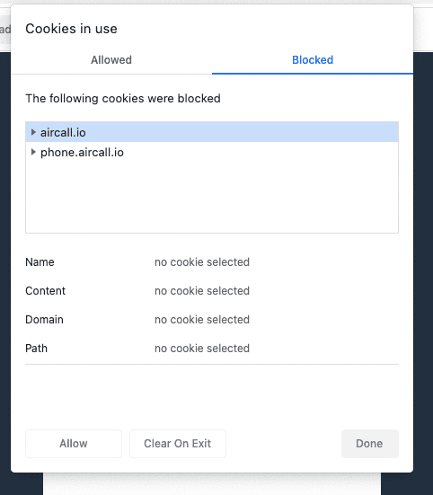 Nota: If any Aircall-related cookies appear under the Blocked tab, the application will not work correctly.